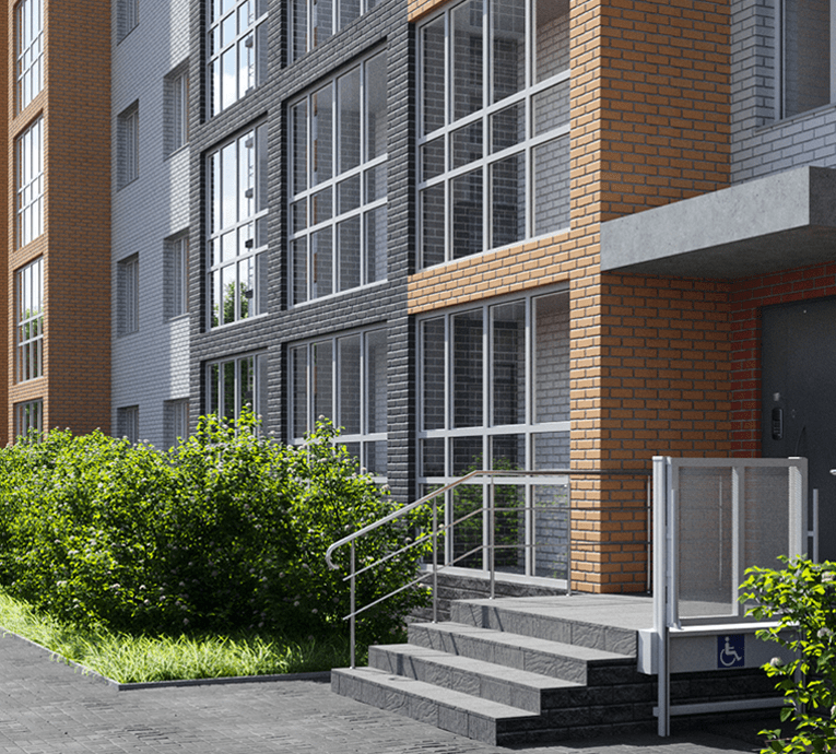 Вход в подъезды будут выполнены по евро стандарту без ступеней с уровня земли что, увеличивает комфорт для жителей, в том числе для семей с детскими колясками и маломобильных групп населения.